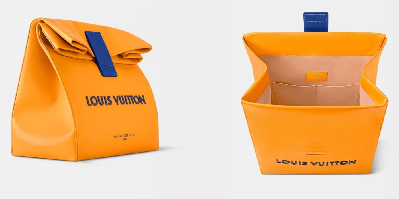 Tento nový produkt má daleko k běžnému papírovému sáčku, ve kterém si lidé nosí jídlo do práce. Louis Vuitton nahradil papír hovězí kůží, zmačkanou vrchní část vyměnil za elegantní přezku a hnědou barvu za typický oranžový odstín, který je charakteristický pro nákupní tašky LV. Samozřejmostí je pak velký nápis značky a vygravírovaný štítkový popis s názvem firmy a rokem založení.