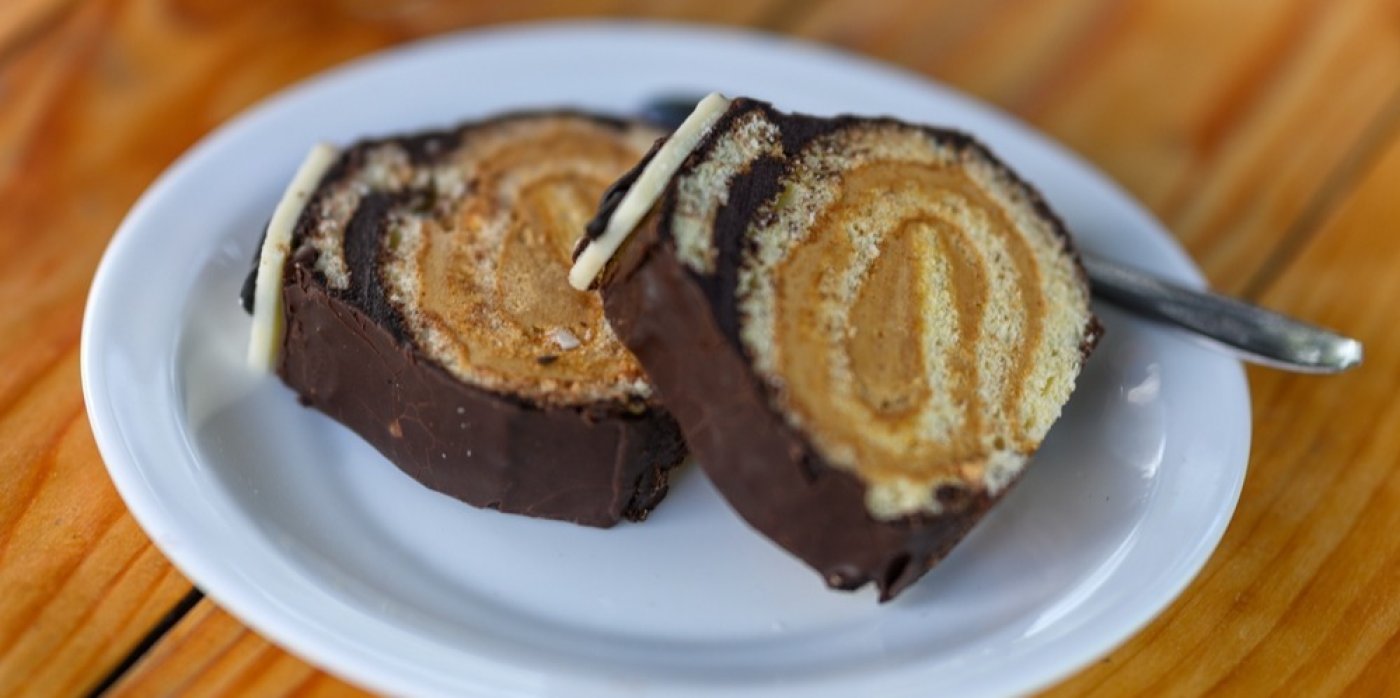 - Na pruh rolády, kterou jste na začátku odkrojili, naneste slabou vrstvu čokoládové ganáže a namazanou stranou ho položte na ztuhlou roládu. Zbývající ganáží potřete celou roládu a nechte zatuhnout.
