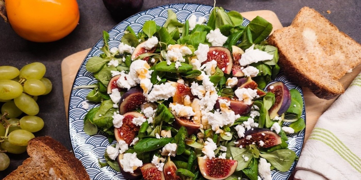 Nebojte se tak kozí sýr přidat do listových salátů. Kozí sýr skvěle ladí s ořechy a ovocem. S ořechů se k němu nejvíce hodí vlašské ořechy, pistácie nebo mandle. Z ovoce můžete sáhnout po borůvkách, brusinkách nebo fících. A teď to zkombinujeme a dáme do salátu, co říkáte? My si vybrali polníček a ke kozímu sýry jsme zvolili kombinaci vlašských ořechů s čerstvými fíky. A jelikož kozí sýr výborně ladí také k vínům, dejte si k salátu skleničku Sylvánského zeleného nebo Veltlínské zelené.