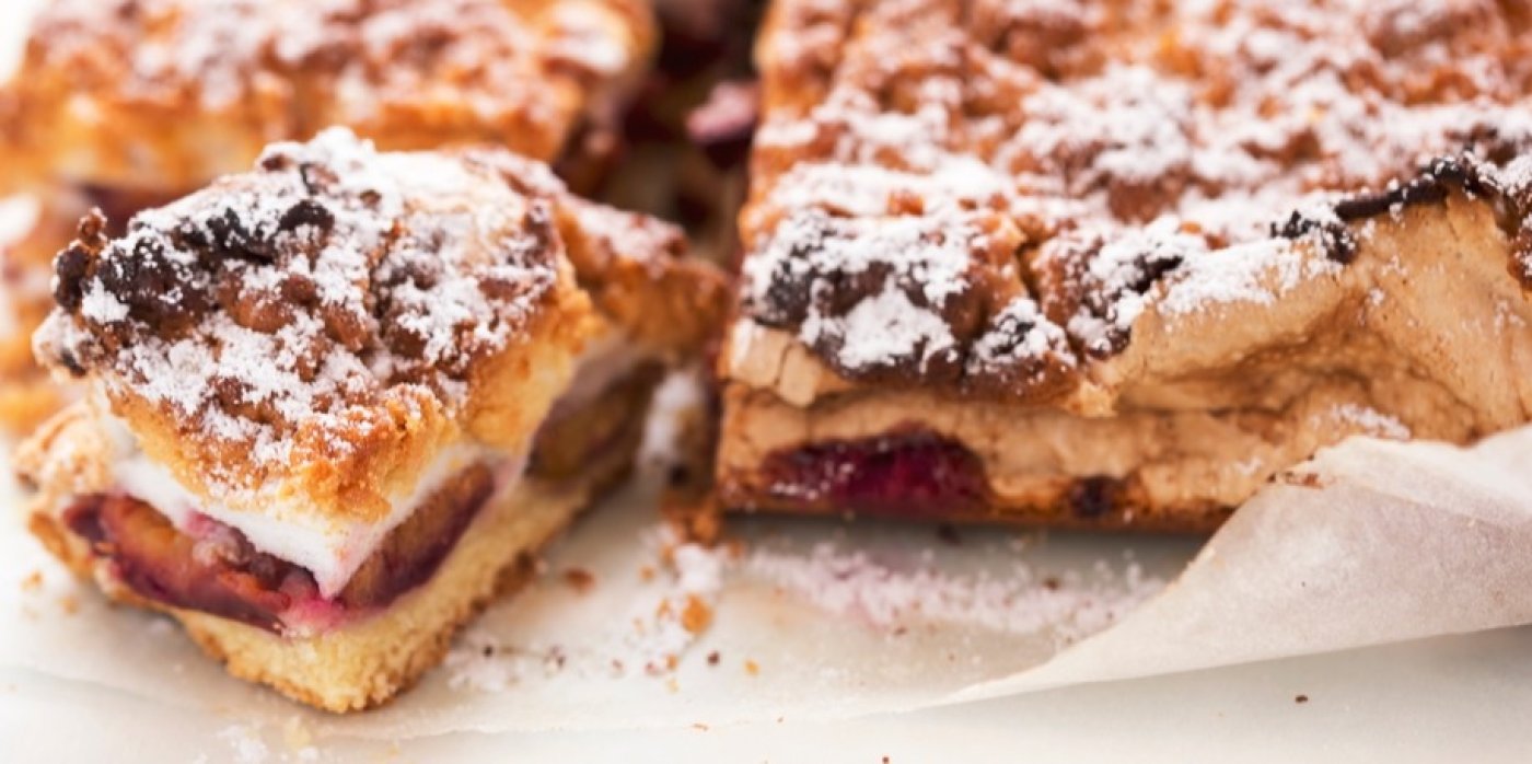 - Na švestky rovnoměrně rozetřete sníh a posypte nastrouhaným zbytkem těsta. Pečte cca 50 minut.