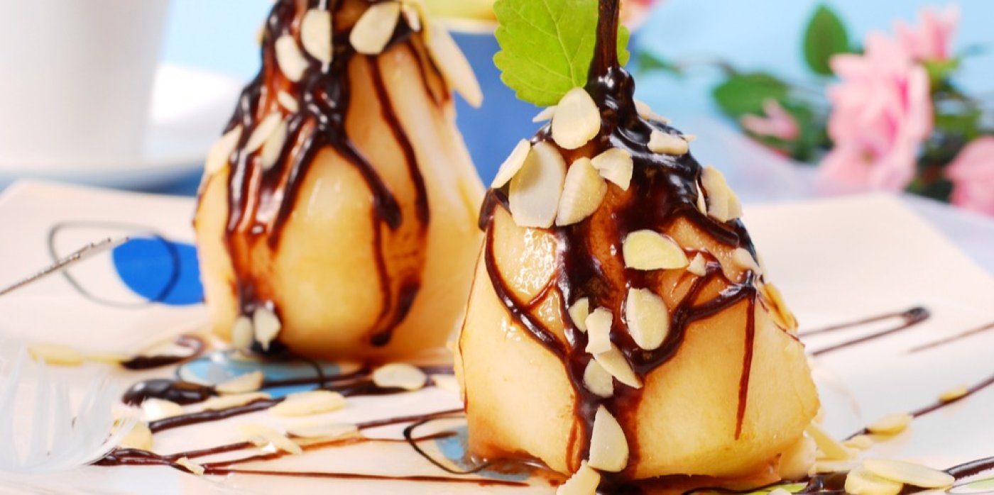 Pošírované hrušky s čokoládovou mandlovou omáčkou