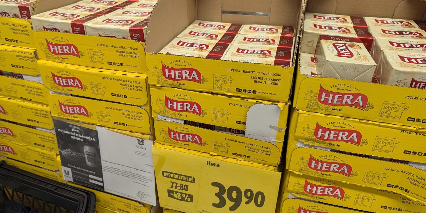 „Zatímco v září ještě atakovaly její průměrné akční ceny za 250g kostku hranici 20 Kč, v říjnu jsme ji mohli koupit o korunu levněji a v listopadu je v rámci letákových akcí k dostání průměrně za 18,20 Kč,“ popisuje Kopčilová cenový vývoj Hery. Lze ji však sehnat i levněji. Pokud se vám poštěstí, koupíte ji v letákových akcích už od 14,90 Kč.