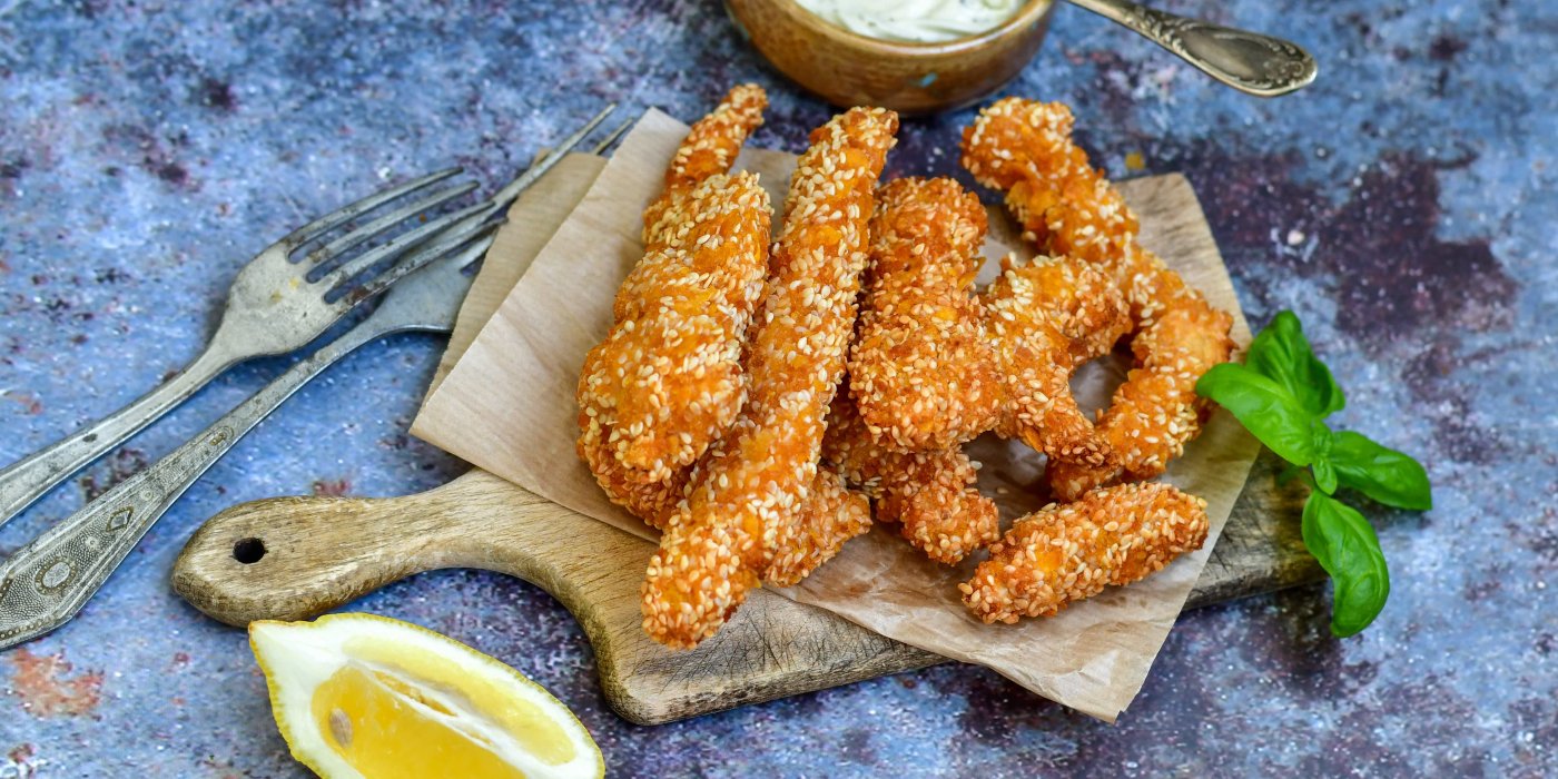 - Smažte kapří proužky po částech dozlatova, aby se rovnoměrně propekly. Po usmažení je nechte okapat na papírové utěrce a obalte v sezamu.