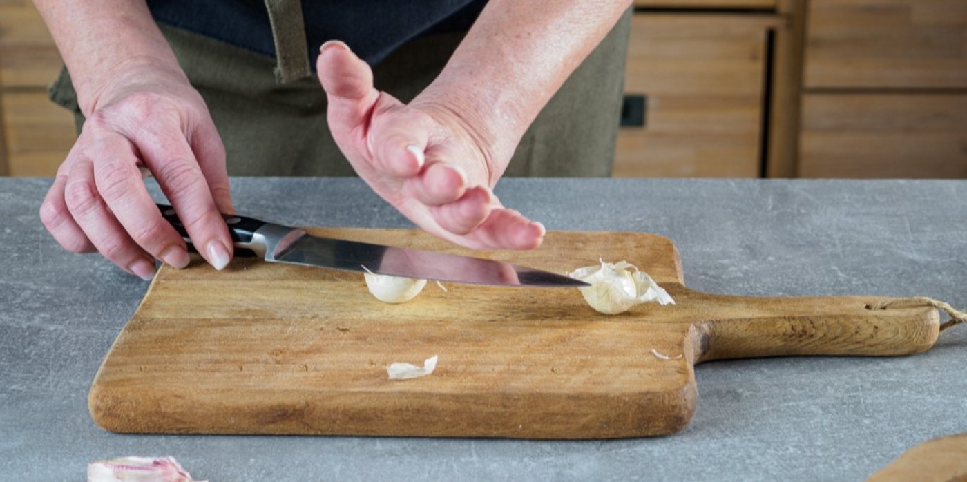 Asi nejznámějším trikem je rozmáčknutí celého stroužku česneku i se slupkou nožem. Tím slupka popraská, povolí a jde snáze odstranit. Funguje to zejména u stroužků menších velikostí. Jen pozor, vyviňte jen mírný tlak, abyste česnek nezničili, zvlášť, pokud ho plánujete strouhat, šlo by to totiž ztuha.