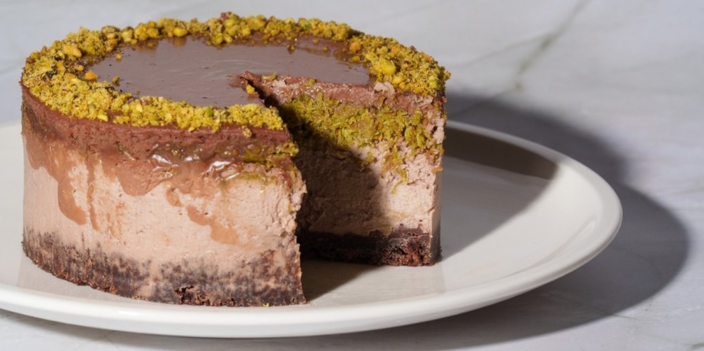 5. Připravte čokoládovou polevu. V hrnci na mírném ohni rozpusťte mléčnou čokoládu se smetanou, dokud nevznikne hladká směs. Polevou přelijte vrstvu těsta a cheesecake ozdobte po obvodu jemně nasekanými pistáciemi. Dejte do lednice a nechte ztuhnout.