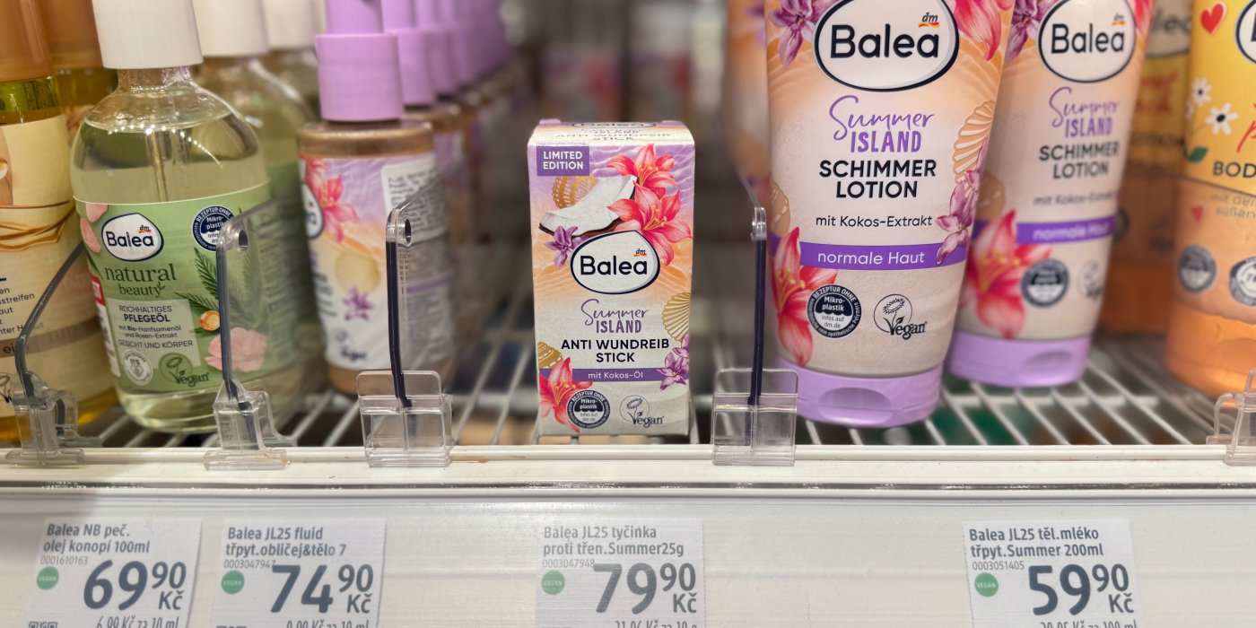V dm drogerii jsme našli limitku od značky Balea z řady Summer Island, která řeší problém s třením pokožky. Stačí ji nanést na stehna a tyčinka vytvoří neviditelný ochranný film, který pomáhá snížit odřeniny. Obsahuje kokosový olej a má veganské složení bez mikroplastů.