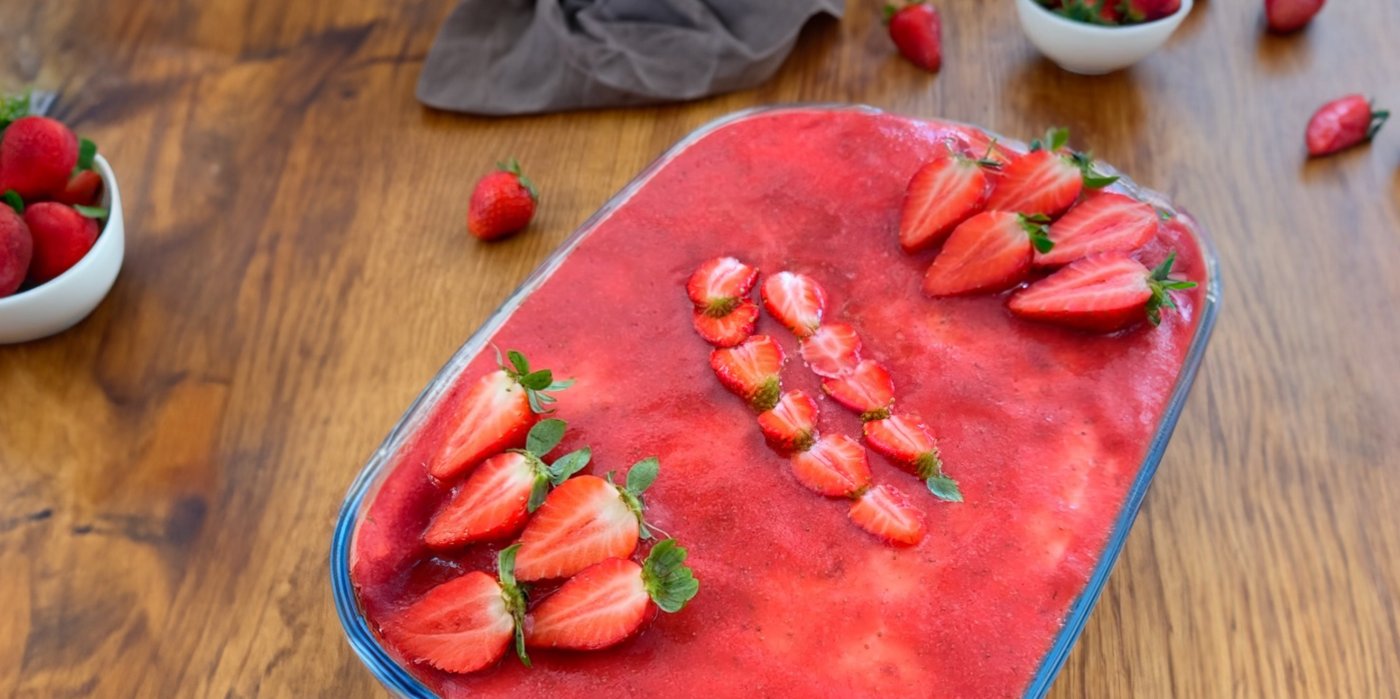 - Dezert ozdobte odloženými jahodami, které můžete rozkrojit na poloviny, a nechte ho minimálně 8 hodin, ideálně přes noc, vychladit v lednici.