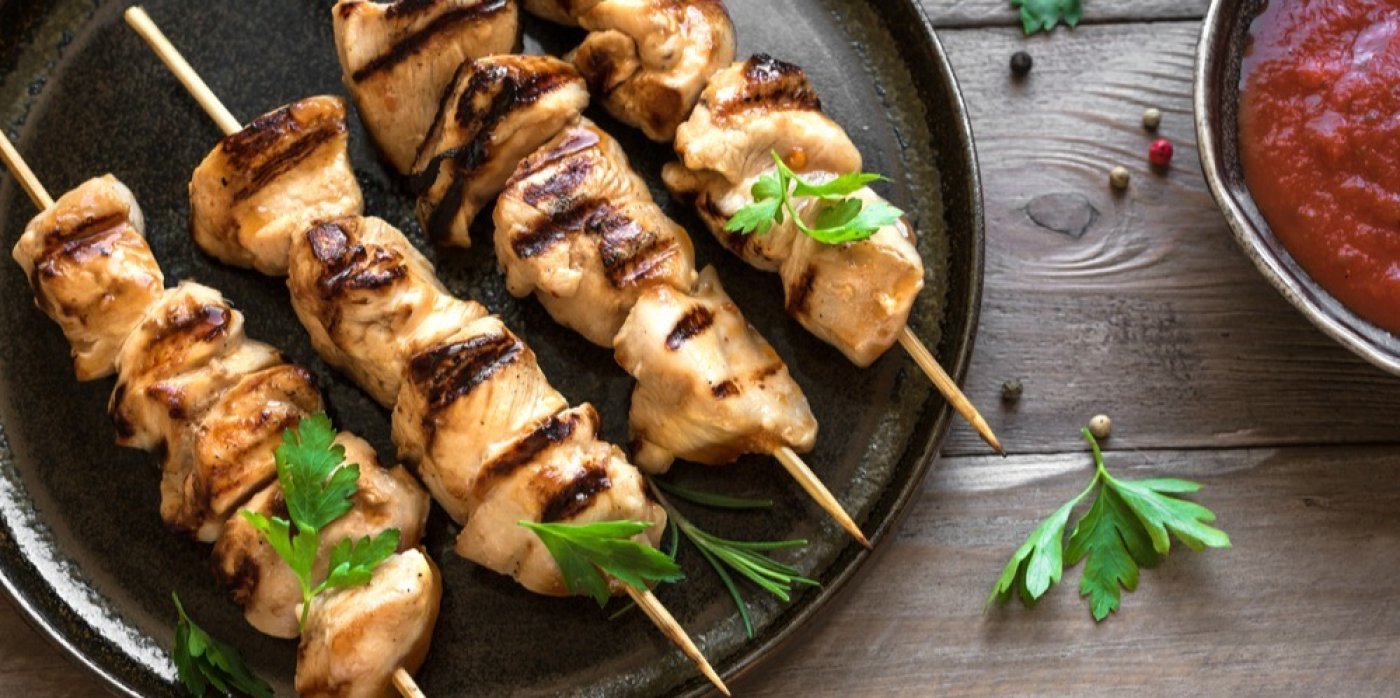 - Po marinování napíchejte kousky masa na špejle. Předehřejte gril nebo grilovací pánev na střední teplotu a maso opékejte ze všech stran dozlatova, což zabere přibližně 10 minut.