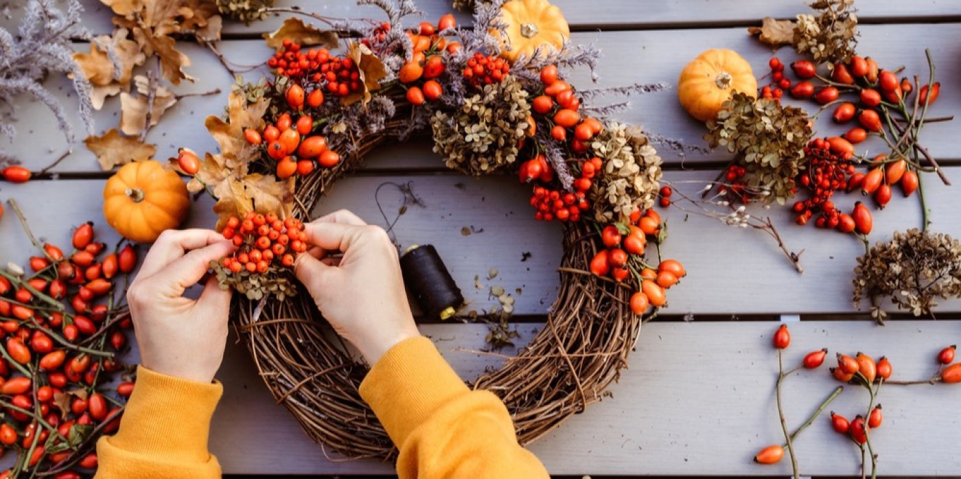 Nasbírejte například rudé šípky či zářivé jeřabiny a použijte je na věnec v celých větvičkách. Pokud máte doma tavnou lepicí pistoli, můžete jednotlivé plody přichytit přímo k podkladu věnce. Budou přesně kopírovat jeho tvar, a věnec tak bude působit uceleným dojmem.