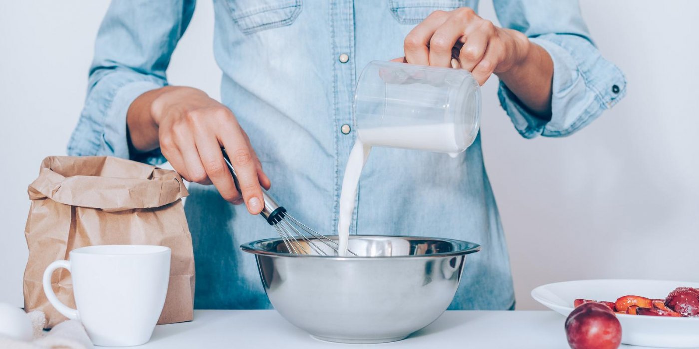 Všechny sypké ingredience dobře promíchejte v misce. Banán rozmačkejte a smíchejte s mlékem, vejcem a přilijte ke zbytku směsi.