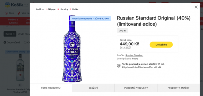 Asociace pro elektronickou komerci během minulého víkendu požádala internetové obchodníky v Česku a Evropě, aby okamžitě zvážili původ a dodavatele výrobků, které ve svých obchodech nabízejí. Jeden z největších on-line supermarketů v Česku Košík.cz začal ze své nabídky vyřazovat zboží, které pochází od výrobců z Ruska a Běloruska. Podle slov mluvčího se zákazníci nemusí obávat výpadku některého zboží, protože prodejce za vyřazené produkty hledá náhradu. Na webu e-shopu Košík.cz lze mimo jiné zboží filtrovat podle země původu. U všech produktů původem z Ruska má e-shop aktuálně informaci o tom, že ukončuje prodej. Kromě vodky tak v e-shopu Košík.cz už nekoupíte časem ani kosmetické produkty značky Rexona nebo oblíbená lízátka Chupa Chups.