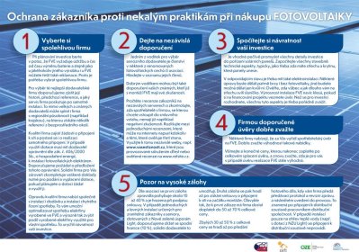 Zájem Čechů o výrobu energií z obnovitelných zdrojů roste. Spolu s tím se ale objevují nekalé praktiky některých dodavatelů. Ministerstvo průmyslu a obchodu nedávno zveřejnilo desatero rad, které by měly pomoci při výběru a spolupráci s dodavateli, na co si dát pozor při výběru dodavatele, jaké podmínky si vyjednat či jak postupovat, když dodavatelská firma neplní podmínky smlouvy.
