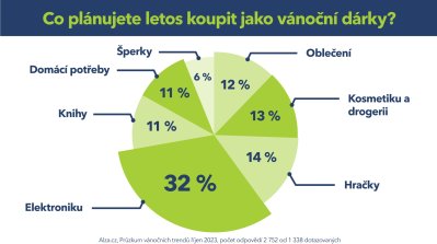 Nejvíce zákazníků plánuje letos jako vánoční dárek zvolit elektroniku, celkem 32 % z nich. Oblíbené jsou ale i hračky, kosmetika, oblečení, domácí spotřebiče a knihy. 24 % z nich má v plánu utratit v rozmezí od 5 000 do 10 000 Kč. 10 % z dotazovaných pak dokonce víc než 20 000 Kč. Vyplývá to z říjnového průzkumu společnosti Alza. Zajímavým výsledkem dotazníku je také fakt, že 23 % respondentů nechává nákupy vánočních dárků na poslední chvíli, respektive na poslední týden před Vánoci. Zákazníci, kteří využívají výdejny si ve srovnání s těmi, kteří nakupují například v obchodních centrech užijí nejen klidné a pohodové Vánoce, ale také ušetří. Z průzkumu vyplývá, že při započítání dopravy do obchodu a časových nákladů na nákup, vyjde jedna cesta do obchodu klidně na 600 i více korun.