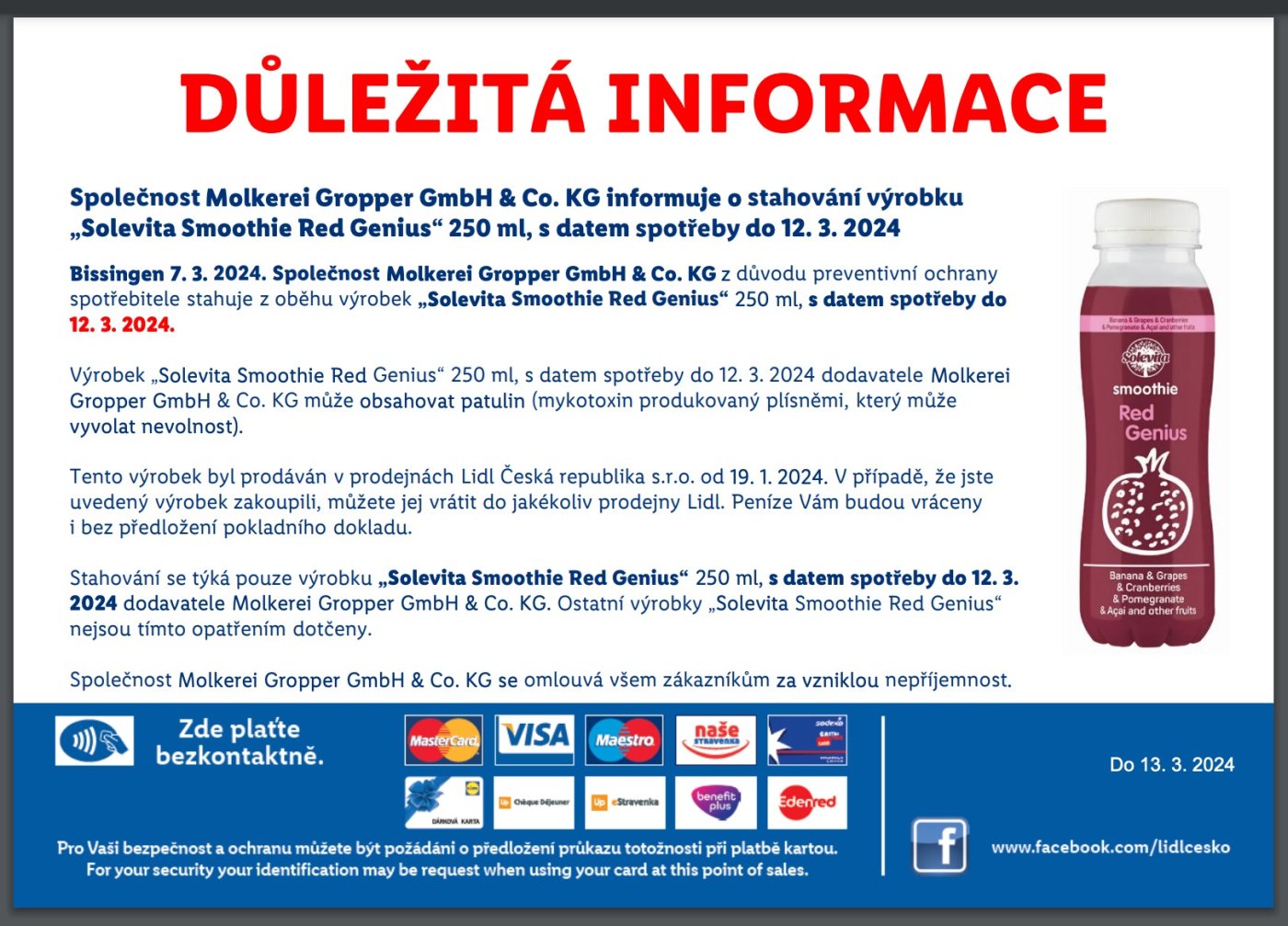 Také na oficiálních stránkách společnosti Lidl ČR se objevilo upozornění na stažení stejného výrobku, tedy Solevita Smoothie Red Genius 250 ml s datem spotřeby do 12. 3. 2024 od společnosti Molkerei Gropper GmbH & Co. KG. Děje se tak z důvodu preventivní ochrany spotřebitele, protože výrobek taktéž může obsahovat toxin patulin (mykotoxin produkovaný plísněmi, který může vyvolat nevolnost). Tento výrobek byl v prodejnách Lidl k dostání od 19. 1. 2024. V případě, že jste jej zakoupili, můžete jej vrátit do jakékoliv prodejny Lidl, kde vám vrátí peníze i bez předložení dokladu.
