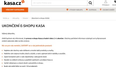 Po více než dvou desetiletích úspěšného působení na českém trhu s elektronikou se e-shop Kasa.cz, jeden z průkopníků v oblasti internetového obchodu v ČR, rozhodl ukončit svou činnost. Tímto krokem se Kasa.cz připojuje k dalším značkám patřícím pod HP Tronic, jako jsou eProton, Euronics nebo Hej.sk, které již dříve podobný osud potkal. Rozhodnutí, oznámené mateřskou společností HP TRONIC Zlín, je součástí strategie zaměřené na posílení značky Datart. Pro zákazníky to znamená, že veškeré jejich objednávky a reklamace budou nadále zpracovávány prostřednictvím Datartu.