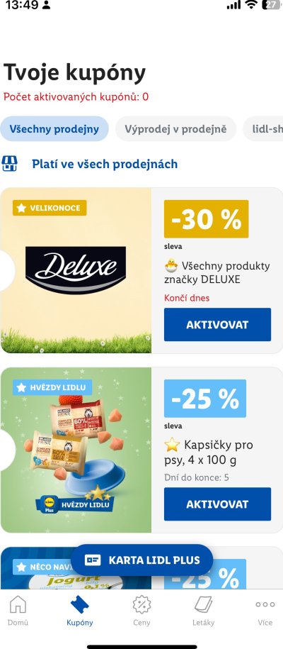 Akční nabídky, při nichž obchodní řetězce snižují ceny vybraného zboží, nejsou ničím neobvyklým. V mobilních aplikacích obchodů, jako jsou Lidl nebo Kaufland, se často objevují slevové kupony. Aby zákazníci mohli tyto slevy využít, je nutné kupony před zaplacením aktivovat. Po aktivaci se sleva automaticky aplikuje v okamžiku platby na pokladně. Například Lidl momentálně nabízí ve své aplikaci slevu 30 % na veškeré zboží z řady DELUXE. V Kauflandu máte možnost prostřednictvím mobilní aplikace získat na „kole štěstí“ až 50% slevu na celý nákup.