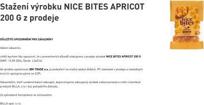 Obchodní řetězce BILLA a JEDNOTA COOP varují zákazníky před konzumací některých šarží sušených meruněk. Důvodem je podezření na výskyt škůdců a bílého povlaku na povrchu ovoce, který může indikovat přítomnost plísně. Závadné produkty jsou okamžitě stahovány z prodeje.