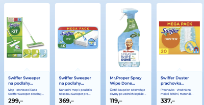Efektivní úklid vyžaduje nejen čisticí prostředky, ale i praktické pomůcky, které usnadní práci. Moderní mopy, prachovky a spreje jsou navrženy tak, aby minimalizovaly námahu a maximalizovaly výsledek. Systém Swiffer Sweeper, který je nyní k dostání jako startovací sada za 299 Kč, kombinuje suché i mokré čištění podlah. Prachovka Swiffer Duster s náhradními hlavicemi za 337 Kč pak efektivně zachytává prach místo jeho rozptýlení do vzduchu. Pro snadný úklid koupelny je ideální Mr. Proper Spray Wipe Done Bathroom Alpin Fresh (800 ml) za pouhých 119 Kč, který odstraňuje vodní skvrny a zbytky mýdla ze všech povrchů.