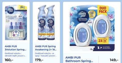 Příjemná vůně dotváří atmosféru domova a může výrazně ovlivnit naši náladu. Moderní osvěžovače vzduchu nejen překrývají nepříjemné pachy, ale aktivně je neutralizují a zanechávají dlouhotrvající svěží vůni. Inovativní AMBI PUR 3Volution Spring Awakening za 160 Kč střídá tři komplementární vůně každých 45 minut, takže si na vůni nezvyknete a budete ji vnímat po celou dobu používání. Pro rychlé osvěžení je ideální AMBI PUR Spring Awakening ve spreji, který v balení 2× 185 ml za 179 Kč představuje výhodnou investici do příjemné atmosféry vašeho domova.