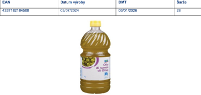Společnost makro Cash & Carry ČR oznámila stažení olivového oleje ARO z pokrutin, konkrétně jednolitrového balení s datem výroby 3. 7. 2024, datem minimální trvanlivosti do 3. 1. 2026 a šarží 28. Na etiketě najdete EAN 4337182184508.