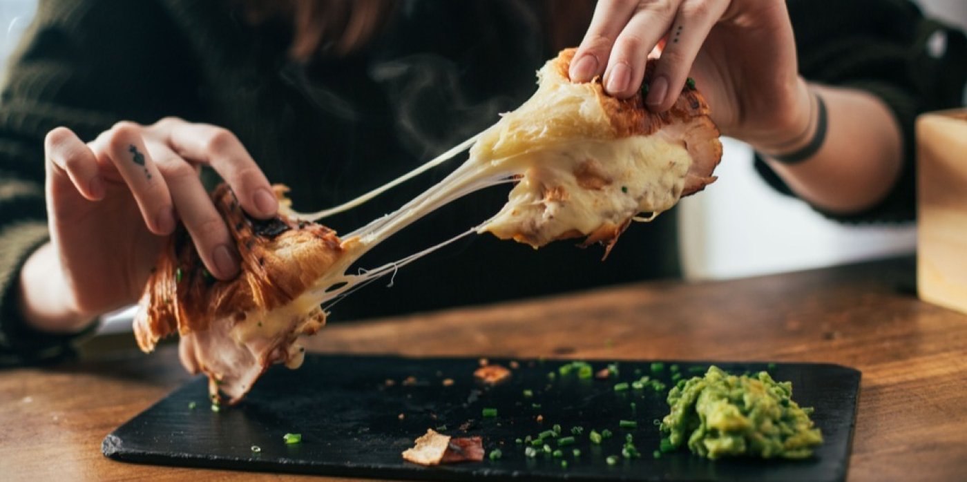 Mladá žena drží v rukou rozpůlený croissant se šunkou a rozteklým sýrem BublikHaus / Shutterstock.com