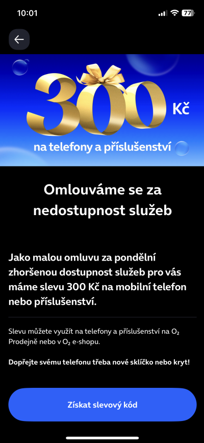 V pondělí dopoledne měl operátor O2 výpadek mobilních služeb, který podle vyjádření firmy ovlivnil zhruba třetinu zákazníků. Společnost chybu přiznala a jako omluvu nabízí jednorázový slevový poukaz ve výši 300 korun.