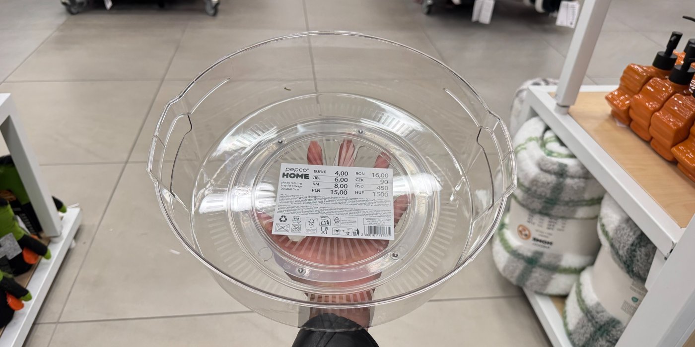 V Action i Pepcu naše redakce narazila na otočný organizér, který je velmi praktický pro organizaci, udržení pořádku v domácnosti a zároveň snadnou dostupnost uložených věcí. Organizér lze otočit o 360°, má průměr 28 cm a najdete ho v prodejnách Action za 79,90 Kč nebo Pepcu za 90 Kč. Je vyroben z průhledného plastu, který neobsahuje BPA. Na obou stranách má praktické ručky na uchopení.