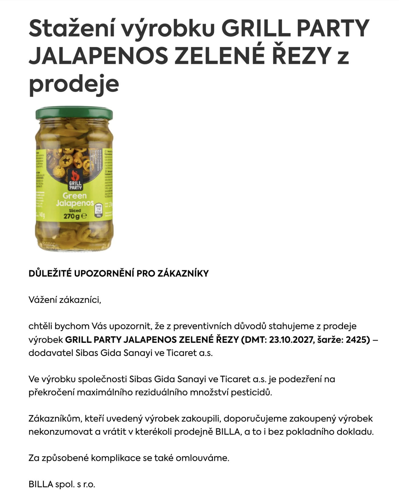 Řetězec BILLA upozorňuje na stažení výrobku GRILL PARTY Jalapeños zelené řezy (DMT 23. 10. 2027, šarže 2425). Dodavatel Sibas Gida Sanayi ve Ticaret a.s. Podle sdělení firmy jde o preventivní krok kvůli možnému překročení limitu pesticidů. Zákazníci mohou výrobek vrátit bez účtenky v jakékoli prodejně.