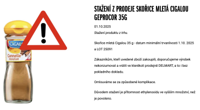 Společnost Delmart stahuje z prodeje Skořici mletou Cigalou 35 g (DMT 1. 10. 2025, LOT 25091). Analýza odhalila ethylenoxid v nepovoleném množství.