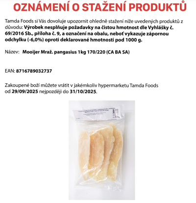 Řetězec Tamda Foods stahuje Mooijer mražený pangasius 1 kg 170/220 (CA BA SA), EAN 8716789032737. Výrobek neodpovídá deklarované hmotnosti, což odporuje vyhlášce č. 69/2016 Sb.