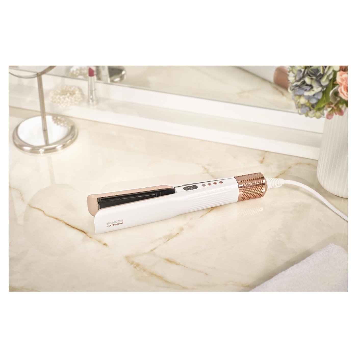 Z podobné filozofie vychází i SENCOR SHI 9100RS Artemiss (5 999 Kč) – žehlička, která suší i žehlí vlasy v jednom kroku. Namísto klasických žehlicích ploch využívá vysokorychlostní proudění vzduchu, takže vlasy uhlazuje bez přímého přepálení.