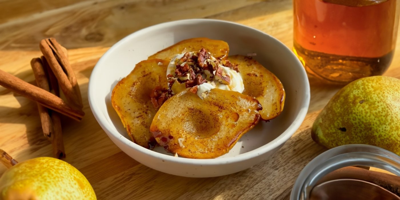 Hrušky jsou jedním z nejvíce opomíjených druhů ovoce, přitom obsahují spoustu vlákniny a antioxidantů. Ideální jsou zralé, ale ne příliš měkké, aby si při pečení udržely tvar. Kombinace se skořicí není náhodná – ta totiž pomáhá regulovat hladinu cukru v krvi a zlepšuje trávení. Javorový sirup zase dodá receptu přirozenou sladkost a jemnou karamelovou chuť, která se s hruškami dokonale doplňuje.