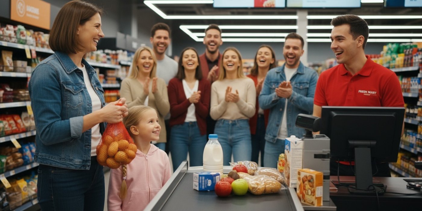 Prodavač a zákaznice s malou dcerou se smějí u pokladny supermarketu Kupi / AI vizualizace