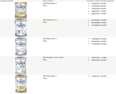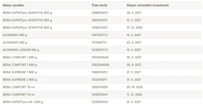 Stažení se týká produktů jako BEBA EXPERTpro SENSITIVE, ALFAMINO, ALFAMINO JUNIOR, BEBA COMFORT a BEBA SUPREME. Kompletní seznam dotčených šarží je dostupný na webových stránkách společnosti Nestlé Česko.
