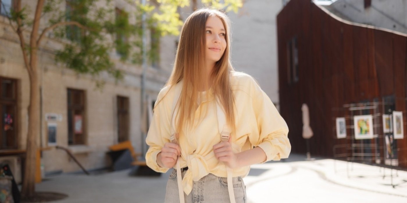 Mladá žena v máslově žluté košili v městském prostředí Sandu Herta / Shutterstock.com
