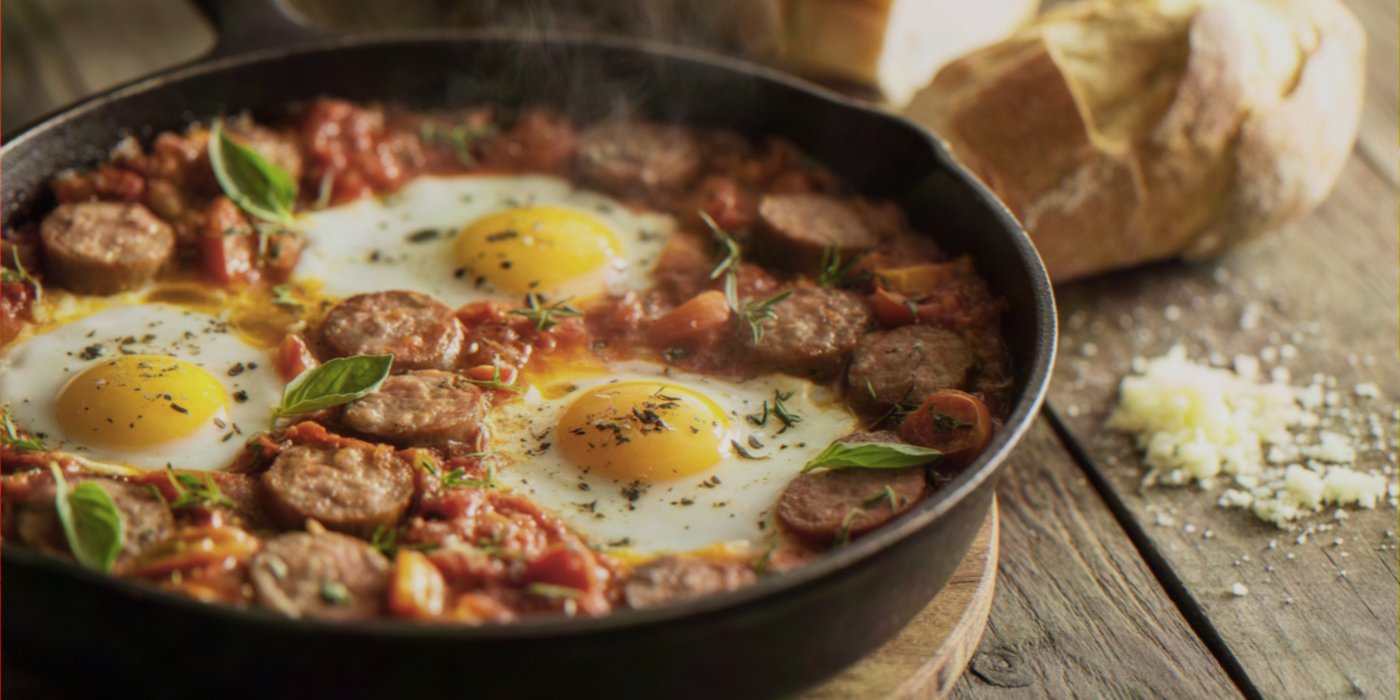 Tenhle recept je přesně ten případ. Místo dlouhého vaření stačí dobře opečená pikantní klobása, rajčata, která dodají šťavnatost, a vejce, které jídlo krásně zjemní. Výsledek je sytý, výrazný a přitom hotový za půl hodiny.