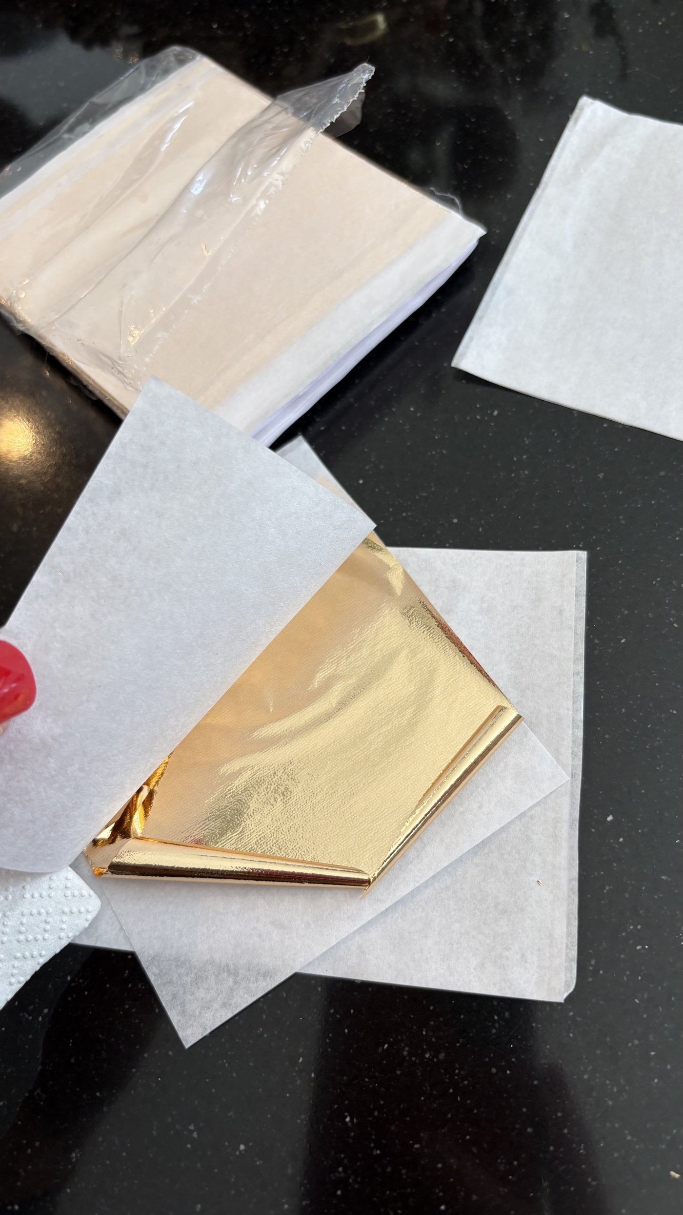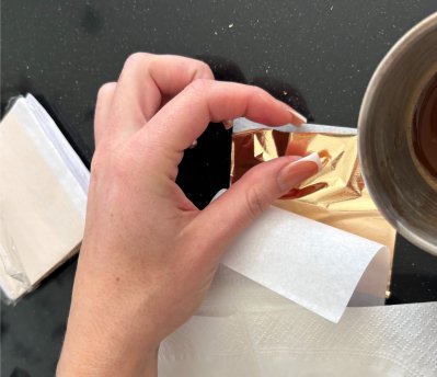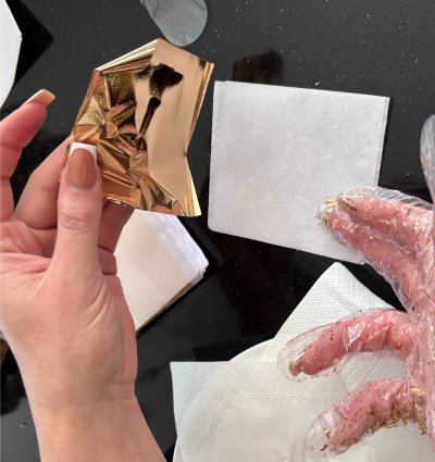 Zlatý papír je velmi tenký a křehký, proto se s ním pracuje nejlépe v rukavicích nebo přes sáček. Plátek v ruce jemně rozmělněte na menší kousky. Nemusí být pravidelné, naopak čím náhodnější tvary, tím zajímavější bude výsledný efekt.