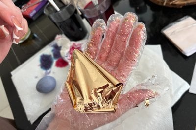 Vejce vezměte do rukavic a jemně ho obalujte v připravených kouscích zlatého papíru. Lehce přitlačujte ze všech stran. Zlato se bude chytat nepravidelně, někde víc, jinde méně. Právě tato „nedokonalost“ vytváří výsledný luxusní vzhled.