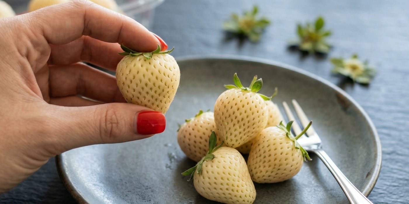 Na první pohled mohou působit nedozrále. Ve skutečnosti jde o vyšlechtěnou odrůdu jahodníku, často označovanou jako pineberry. Typická je světlá dužina a červená semínka.