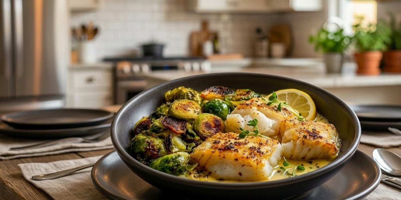 Treska s citronovo-česnekovou máslovou omáčkou a pečenou růžičkovou kapustou je recept, který spojuje jednoduchou přípravu s výraznou chutí. Ryba se připravuje rychle na pánvi, zatímco kapusta se peče v troubě téměř bez dozoru. Výsledkem je vyvážené jídlo, které se hodí jak na běžnou večeři, tak i ve chvíli, kdy chcete uvařit něco lepšího bez složitostí.