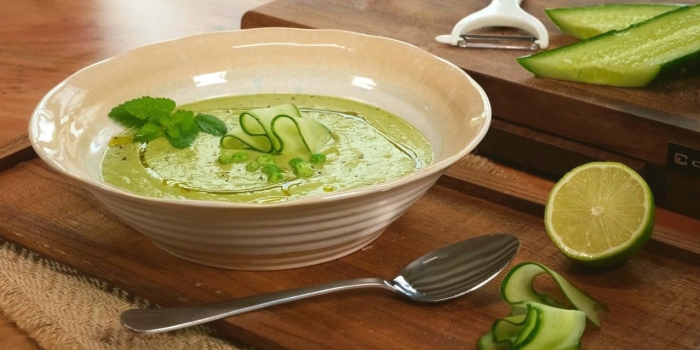 Lahodné a osvěžující v horkých dnech. Ochutnejte okurkové gazpacho s avokádem a hráškem