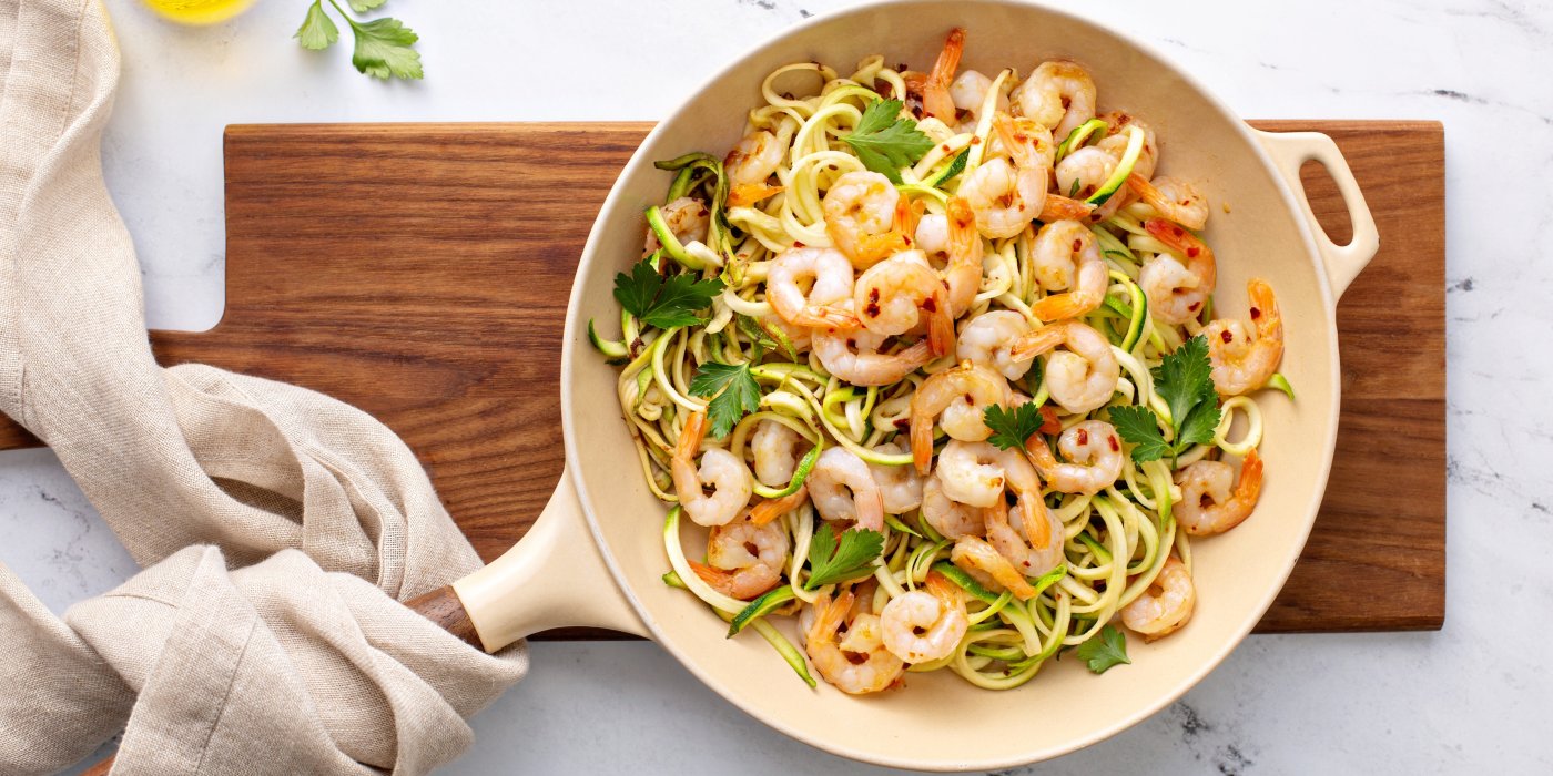 Lehký, krémový a neskutečně rychlý recept na cuketové nudle s krevetami, cherry rajčaty a smetanovým sýrem