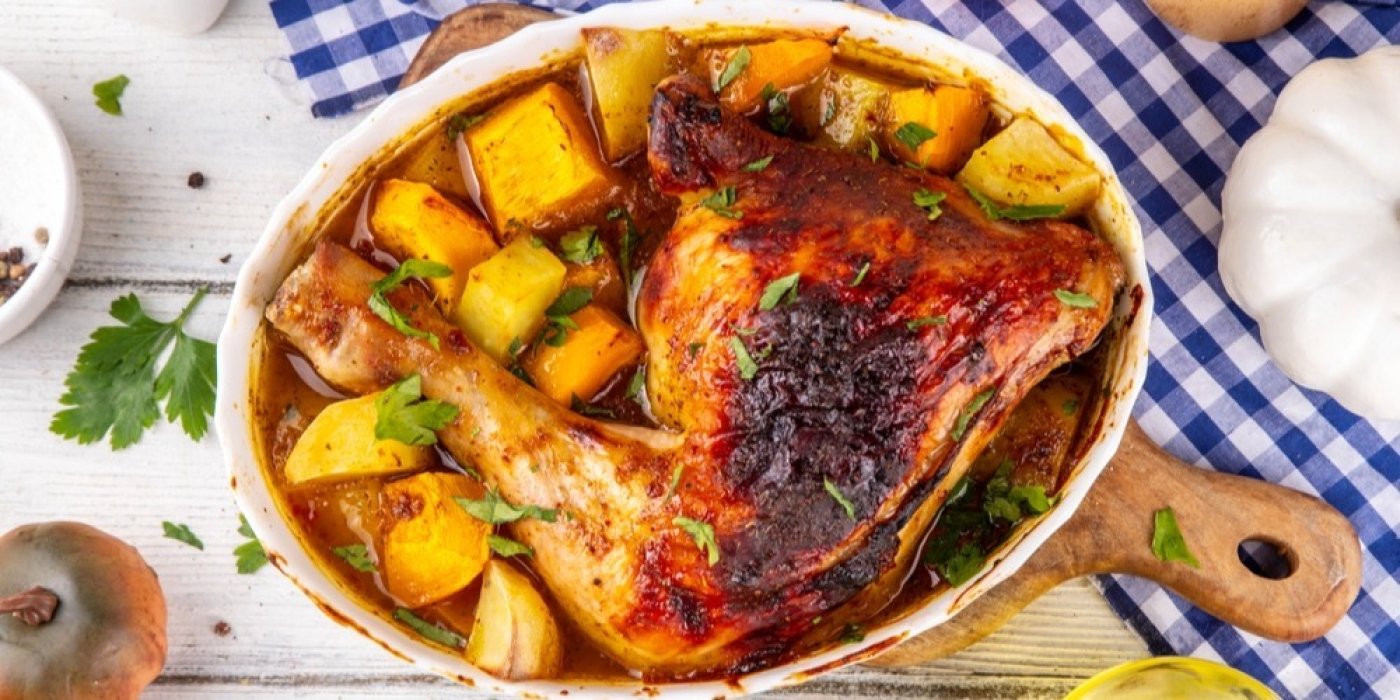 Pečené kuřecí čtvrtky s dýní a omáčkou: Šťavnatý podzimní oběd z jednoho pekáče