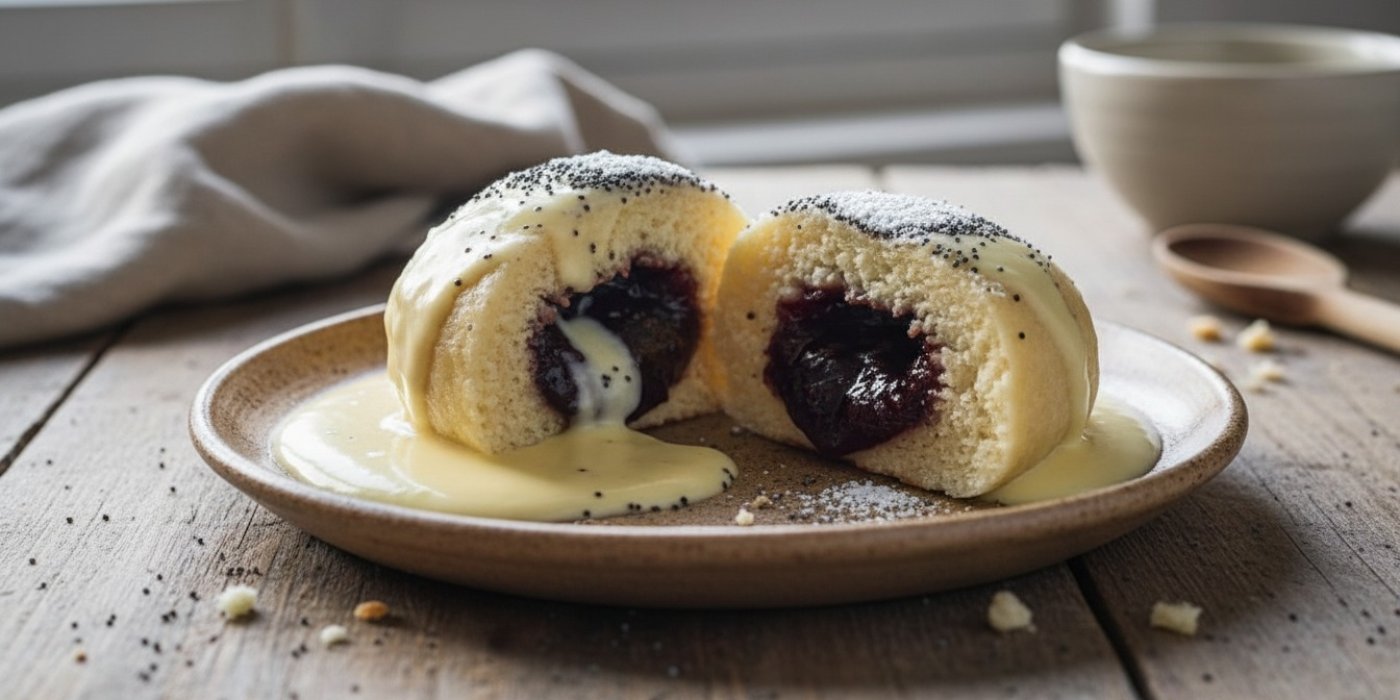 Alpský kynutý knedlík vařený v páře, plný povidel a s vanilkovou omáčkou, chutná jako z rakouské sjezdovky