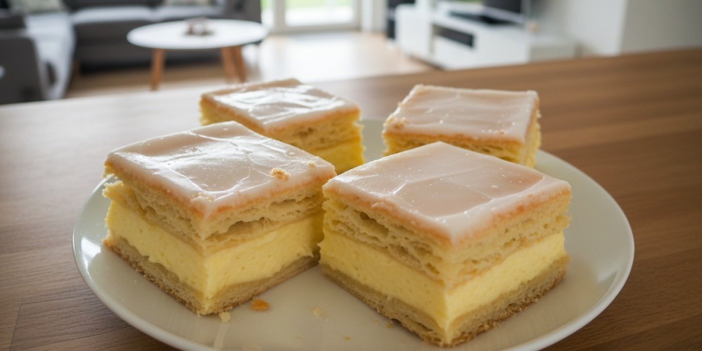 Recept na křupavé, ale vláčné žloutkové řezy z listového těsta s vanilkovým krémem a citronovou polevou