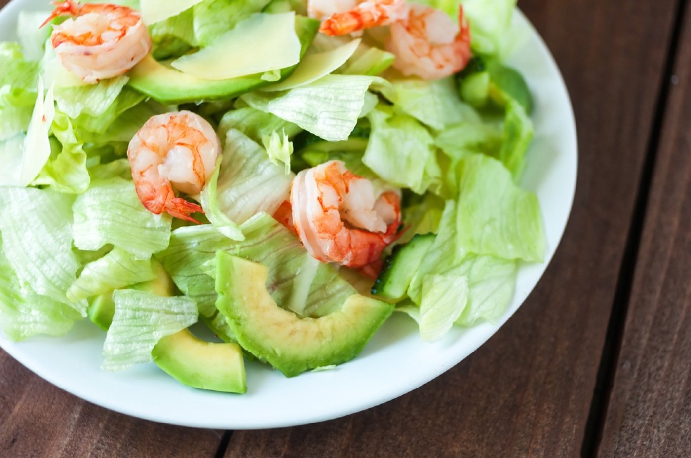 Na talíře urovnejte natrhaný ledový salát, přidejte kousky avokáda a krevety.