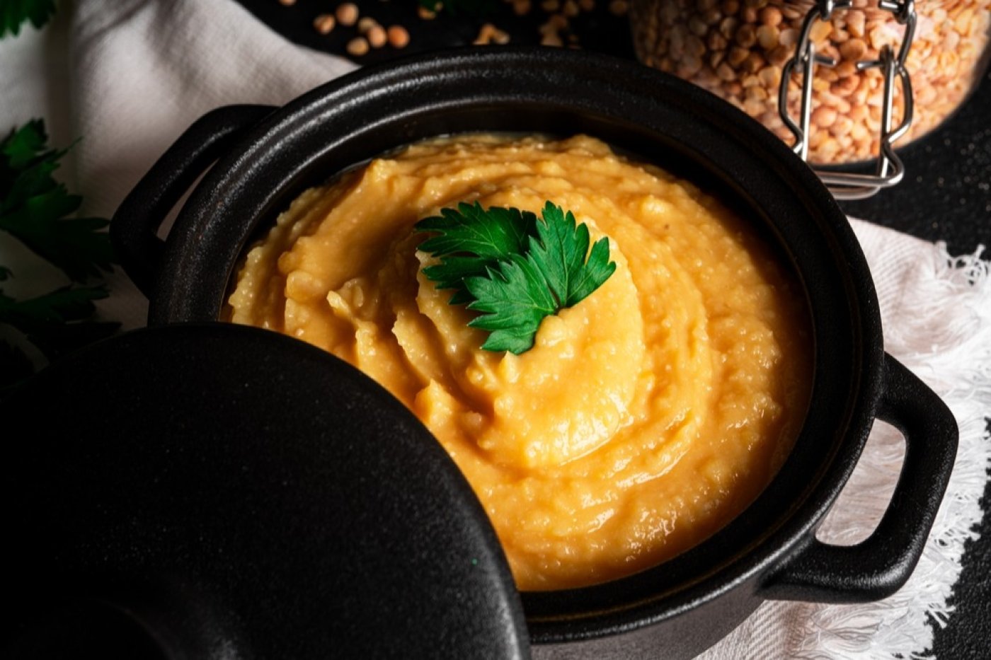 Hrachovou kaši promíchejte. Pokud by se zdála moc hustá, můžete naředit vývarem z hrachu nebo vodou.