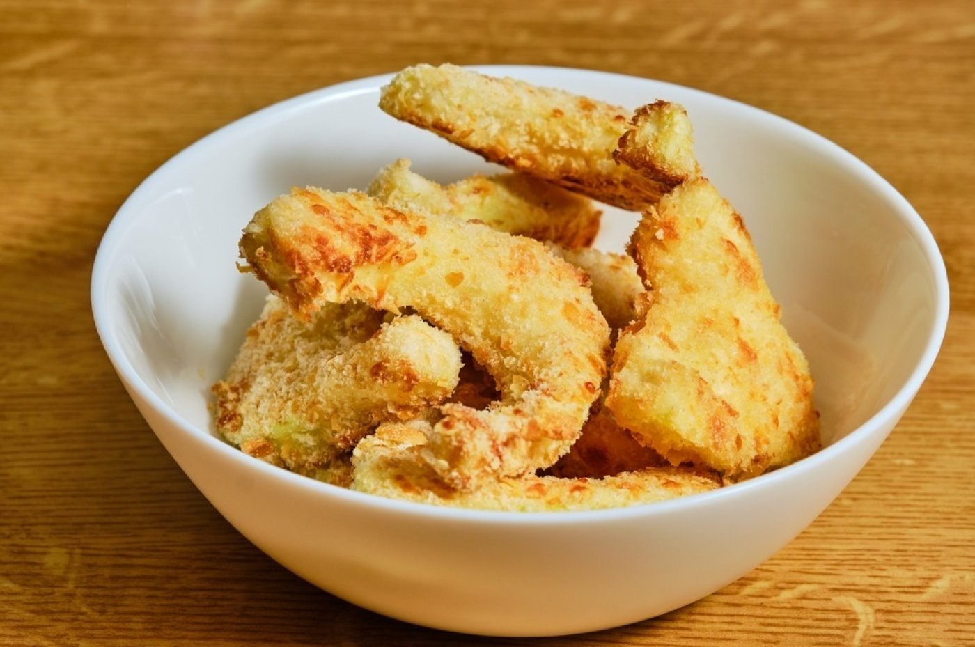 Kousky osušeného patizonu obalte v mouce, poté ve vejcích a nakonec v ochucené strouhance.
