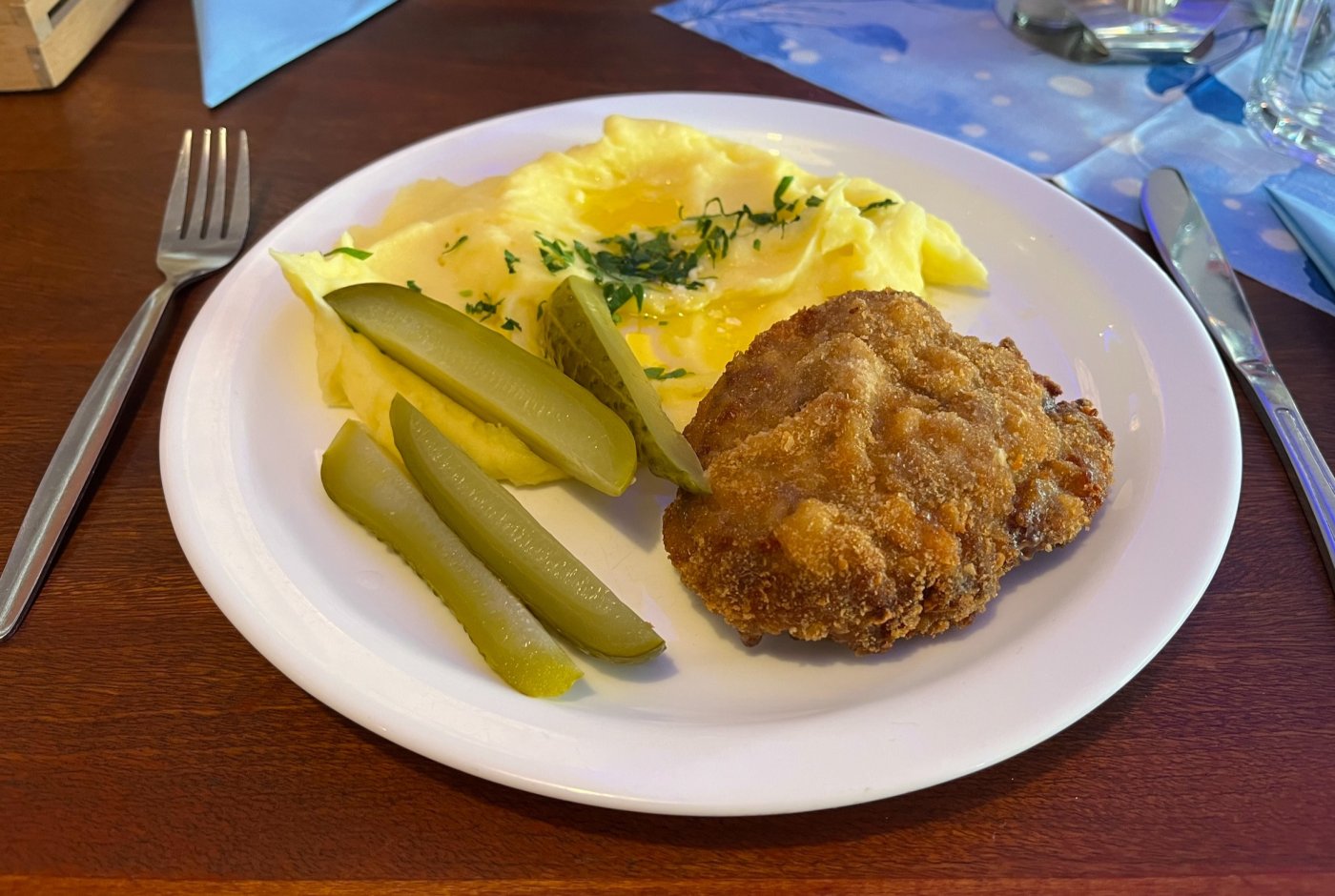 K holandským řízkům se skvěle hodí bramborová kaše, případně vařený brambor a kyselá okurka.