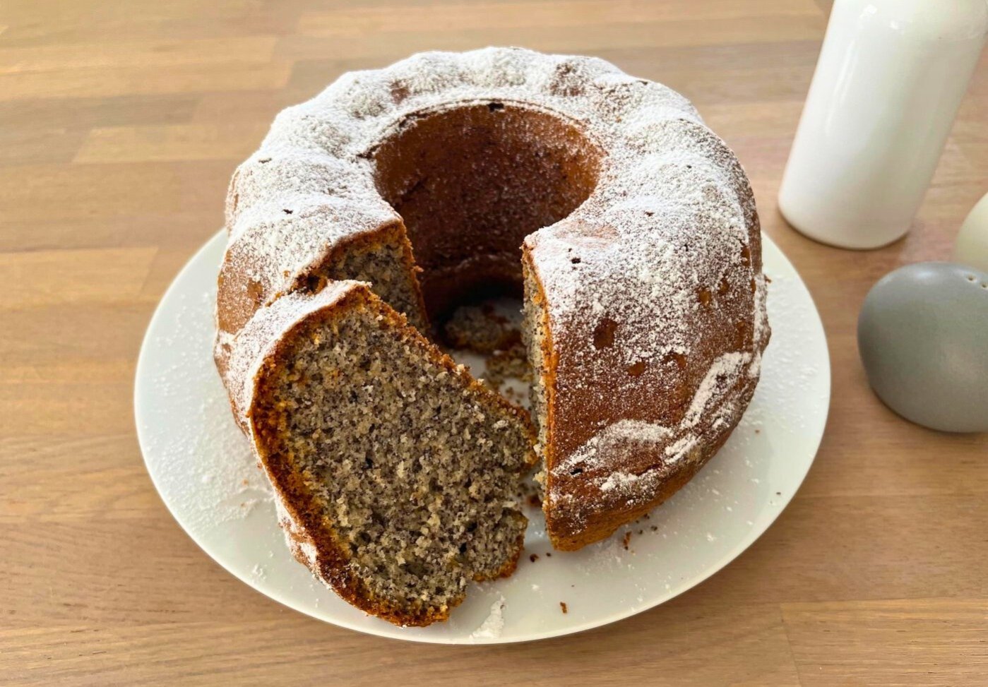 Po upečení nechte bábovku chvíli vychladnout, poté ji vyklopte na podnos nebo talíř a pocukrujte moučkovým cukrem.